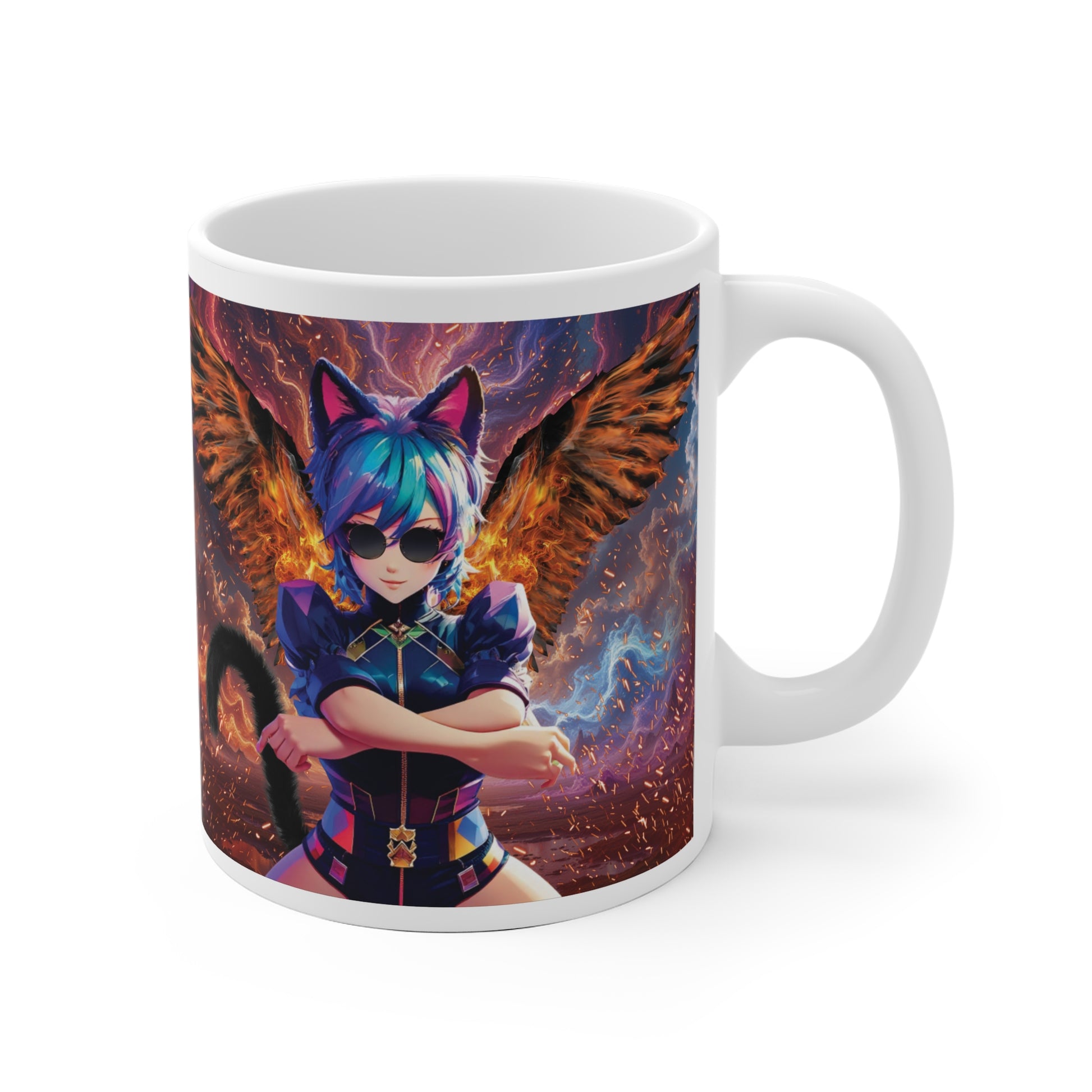 Unleash the power of anime fantasy with this bold girl warrior mug featuring neon cat ears, sleek sunglasses, majestic flaming wings, swirling embers, and shimmering ice. Perfect for fans of cyberpunk and mystical themes, and ideal for those who enjoy unique and vibrant designs. Great for gifting on birthdays, holidays, or special occasions.