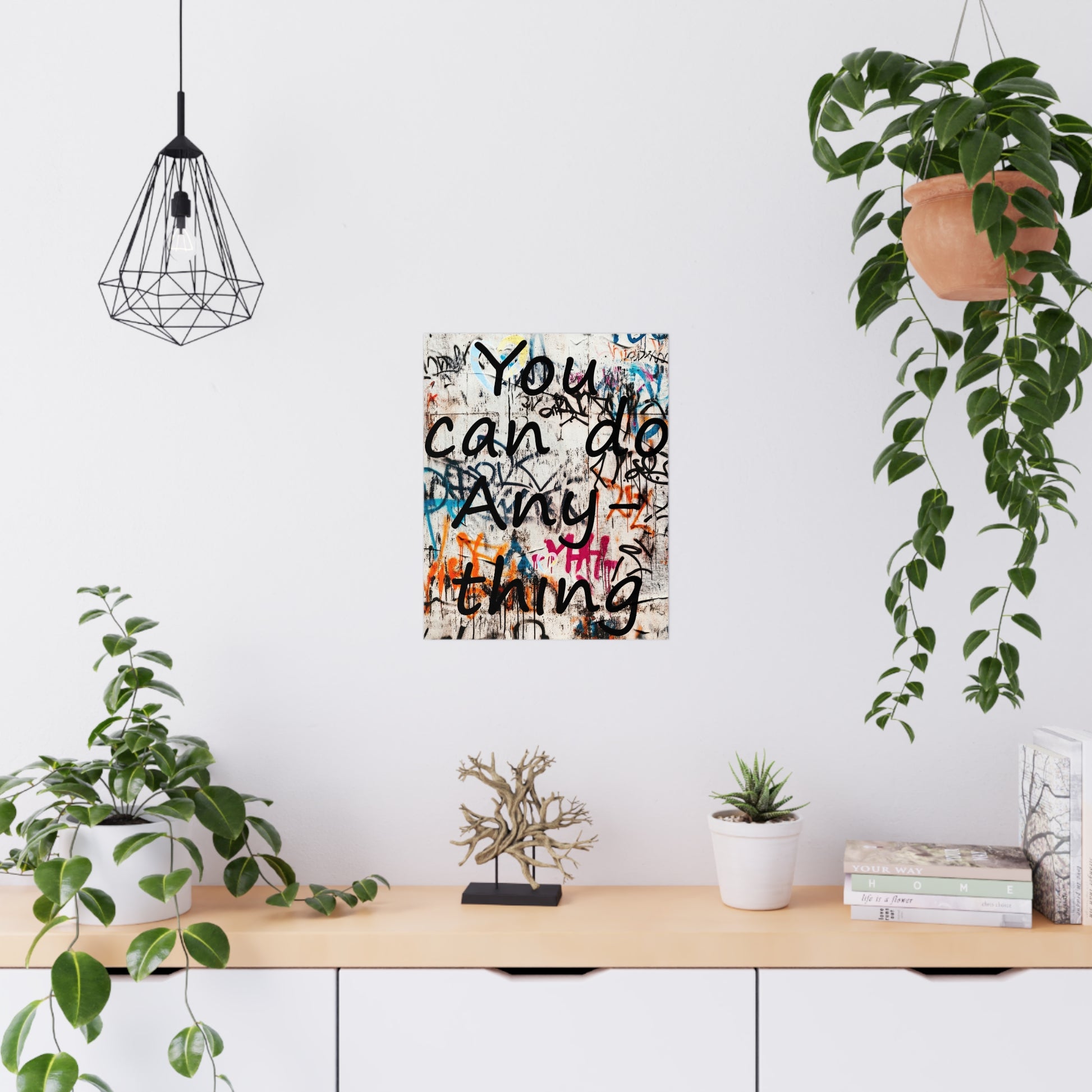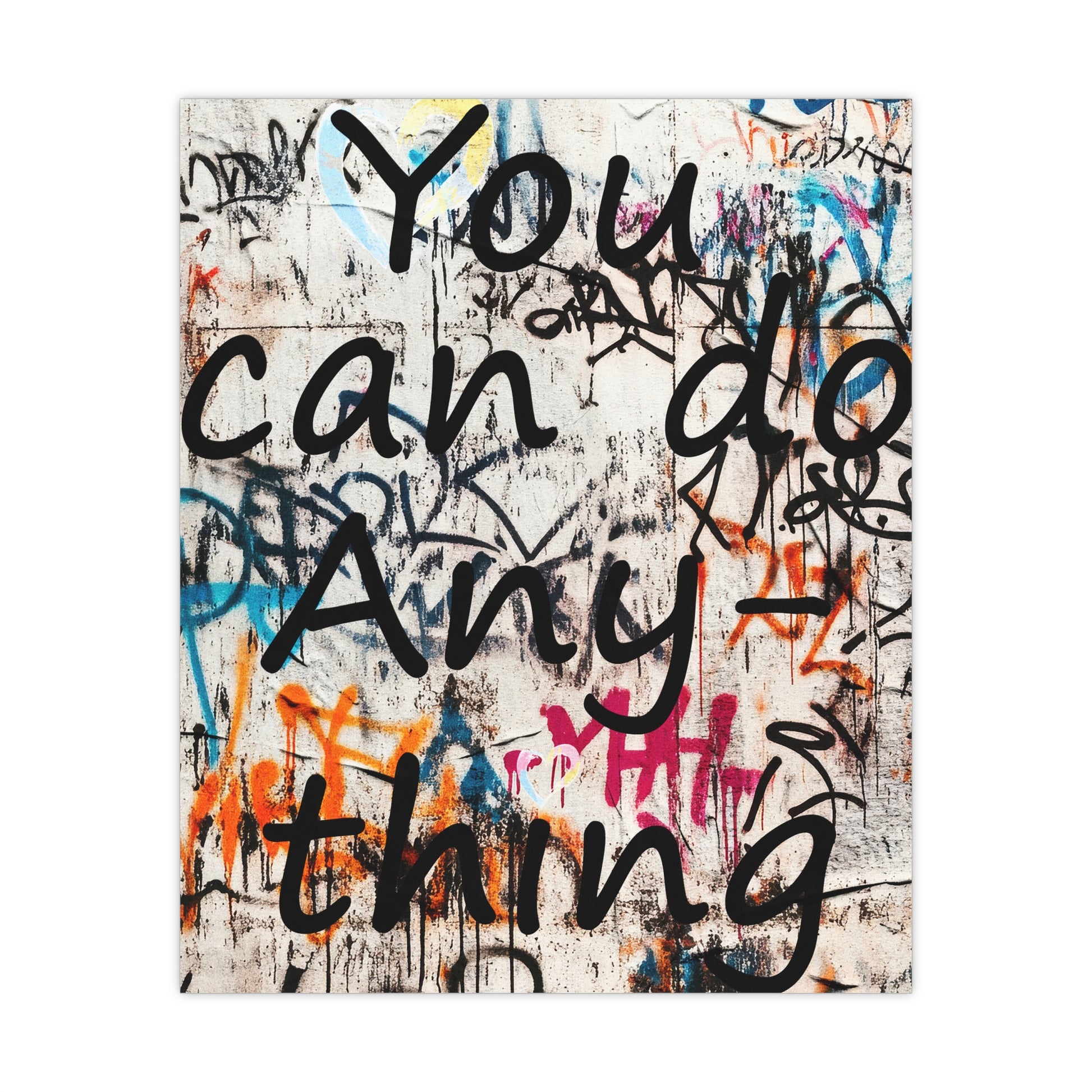 Empowered Graffiti: Urban Motivation Bold, inspirational street art featuring the empowering message 'You can do Anything' against a vibrant graffiti-covered wall. This raw, authentic urban artwork combines gritty textures with an uplifting mantra, perfect for motivational home decor, office spaces, or creative studios. Ideal for street art enthusiasts, modern minimalists, and anyone seeking daily encouragement through edgy, contemporary wall art with positive affirmations. Perfect for decorating dorm rooms, home offices, or art studios. Great for those who appreciate urban art and want a daily dose of motivation in their space. Relevant for gift-giving occasions such as graduations, birthdays, and motivation milestones.