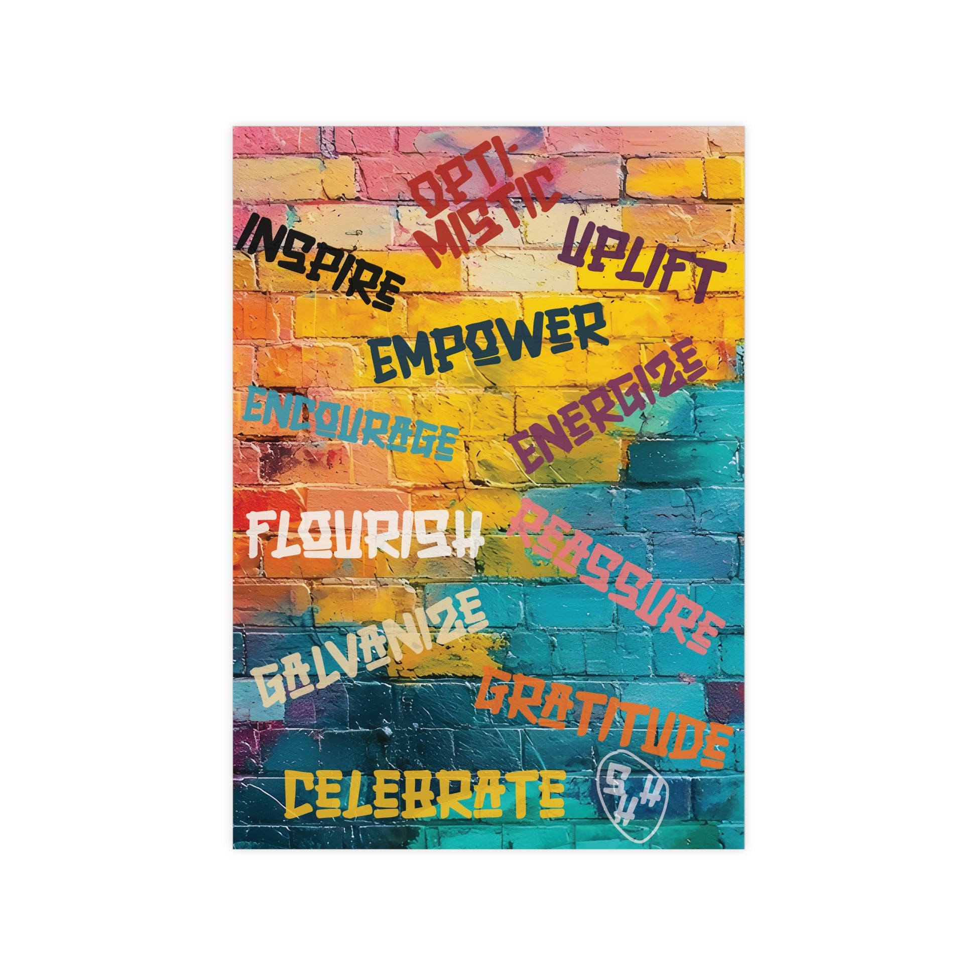Ignite your passion with this vibrant graffiti-style art, bursting with bold words like Inspire, Empower, and Flourish. Perfect for daily motivation, this wall of positivity brings energy, hope, and strength. Ideal for motivational posters, empowering t-shirts, and uplifting merchandise. Stay driven. Stay inspired. Be unstoppable. Transform your space with our vibrant, eye-catching posters. Each piece is designed to inspire and uplift, perfect for brightening up any room in your home or office. Offering a variety of motivational words and colors, these posters resonate with positivity and energy, making them a wonderful addition to a creative workspace or a cozy living room. Ideal for anyone looking to enhance their environment through art, they appeal particularly to young adults, students, and professionals alike. Perfect for housewarming gifts, birthdays, or simply as a personal treat. Celebrate life's milestones or everyday victories with these unique expressions of encouragement!