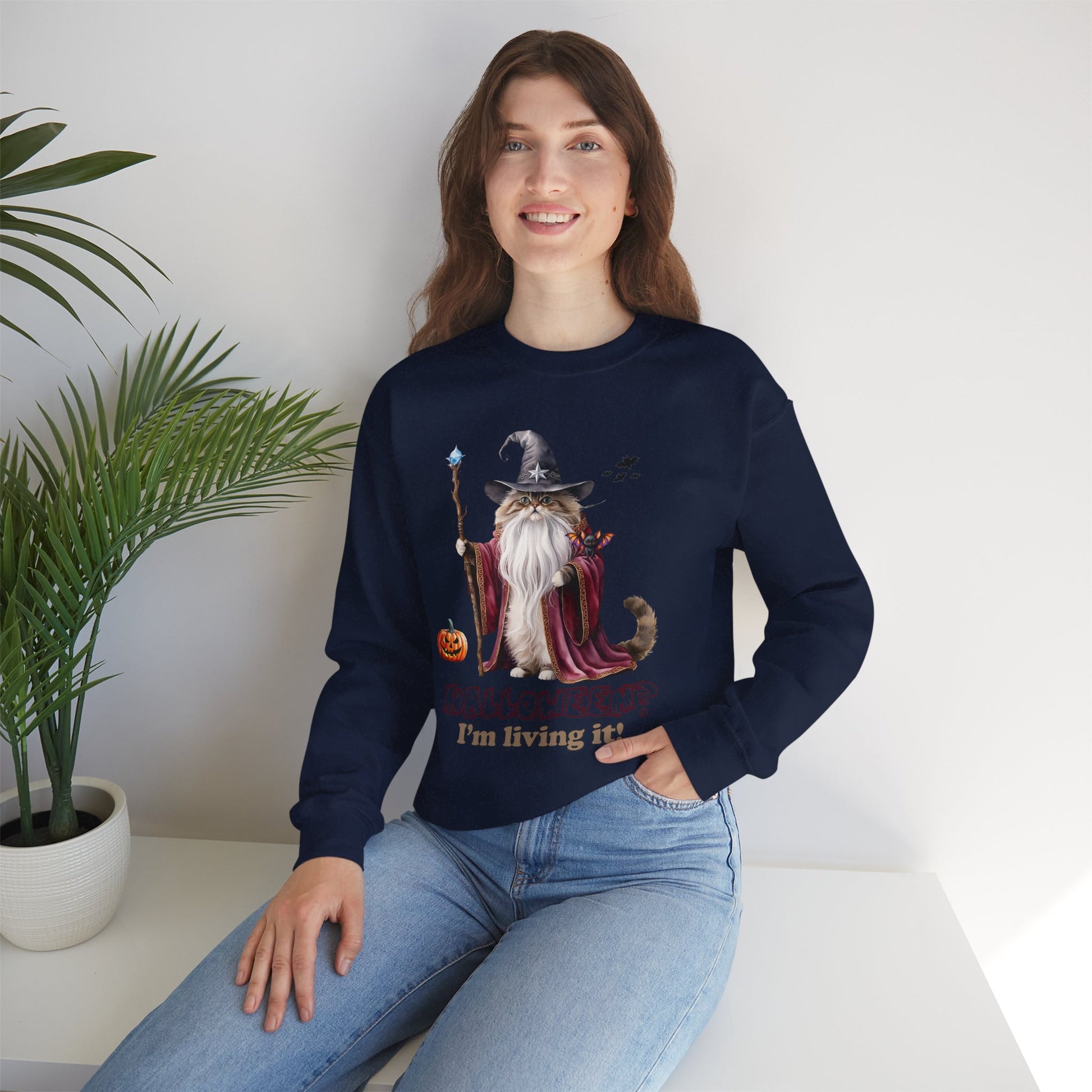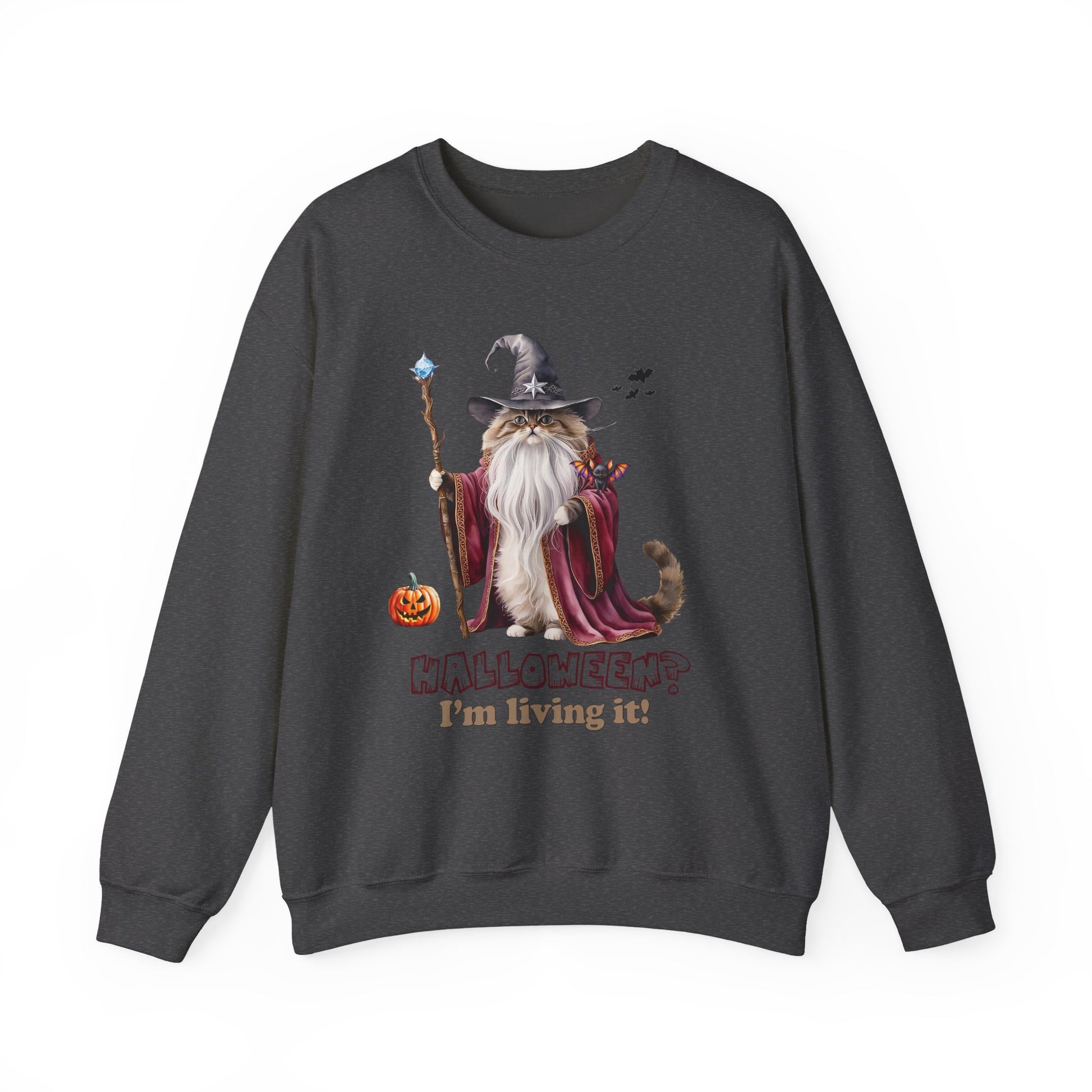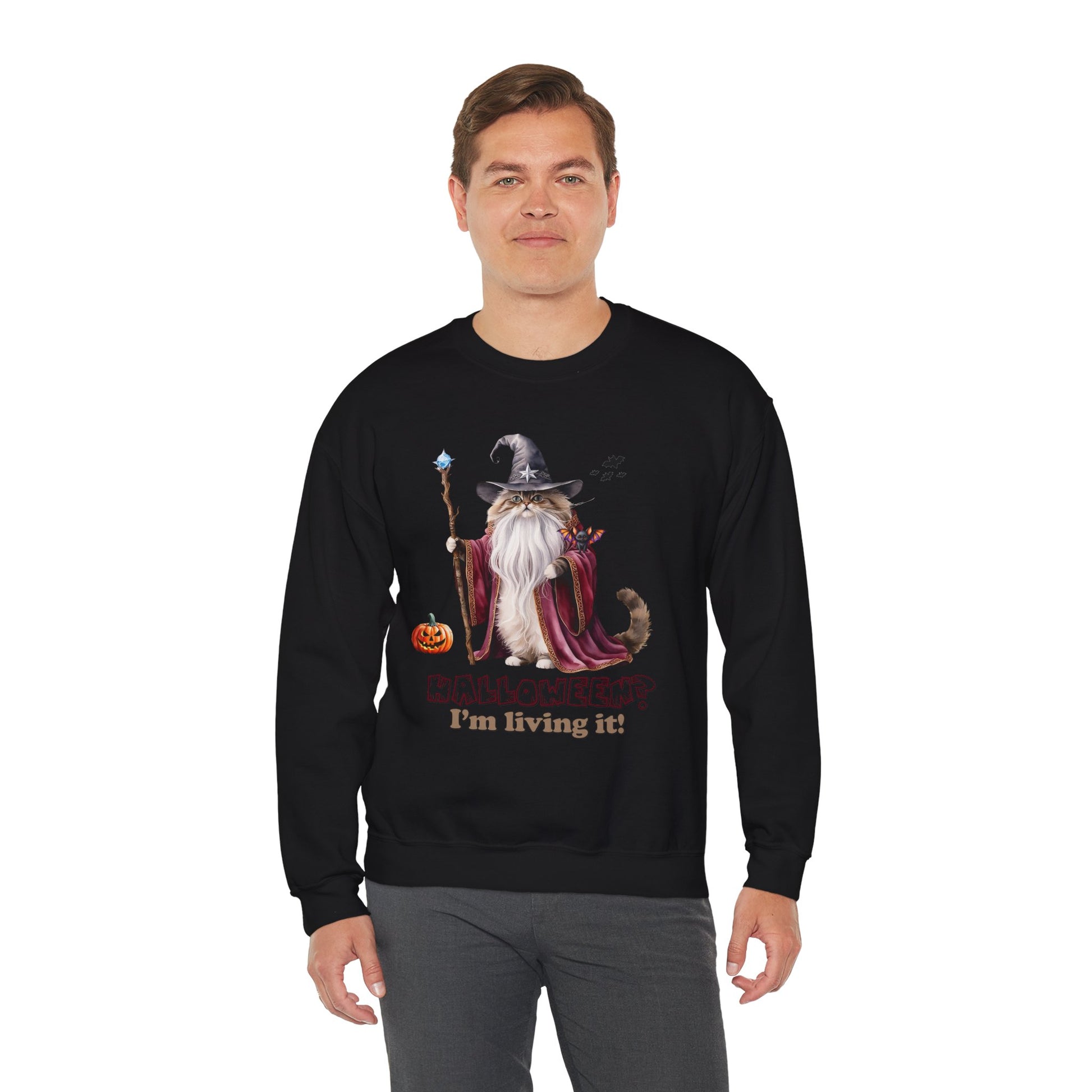 πŸ§™ Living the Spell: Wizardry, Whimsy & Halloween Cheer πŸŽƒ - Halloween Wizard Sweatshirt, Unisex Crewneck for Fall, Cozy Gift for Cat Lovers, Spooky Season Apparel, Fun Costume Alternative