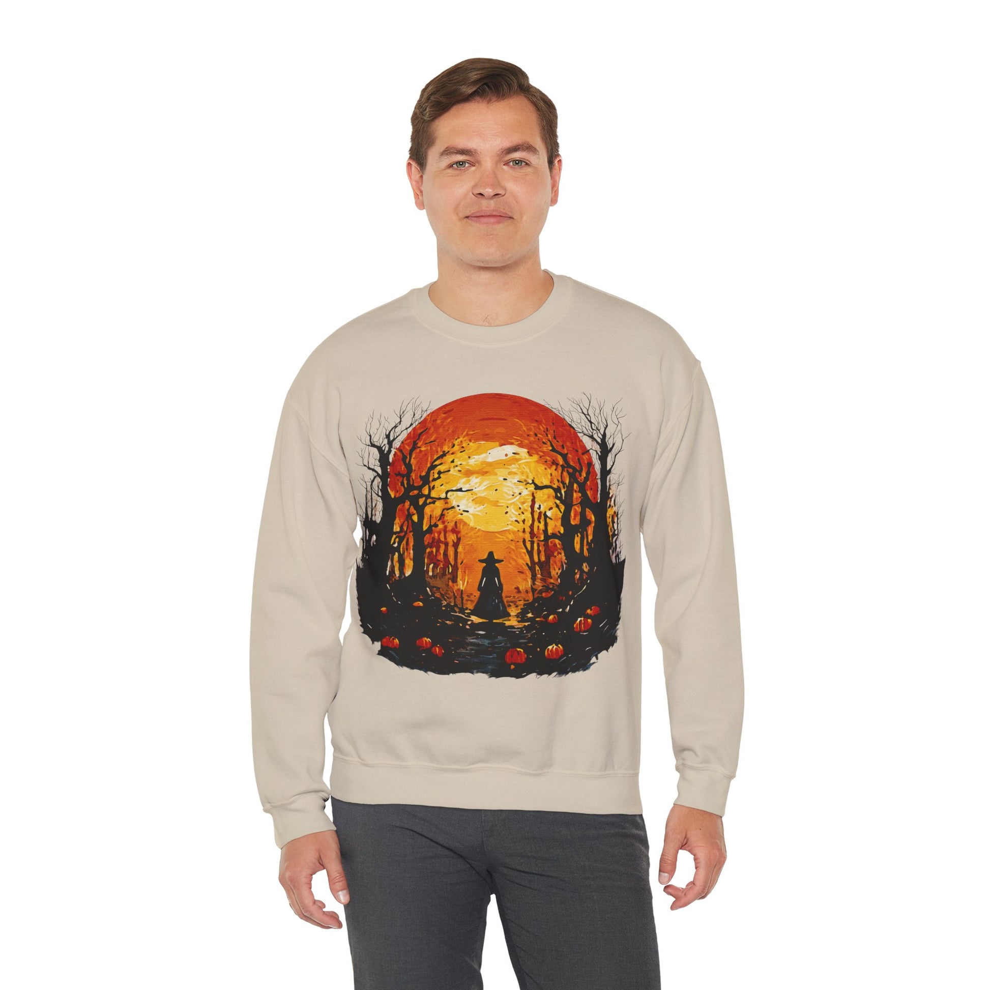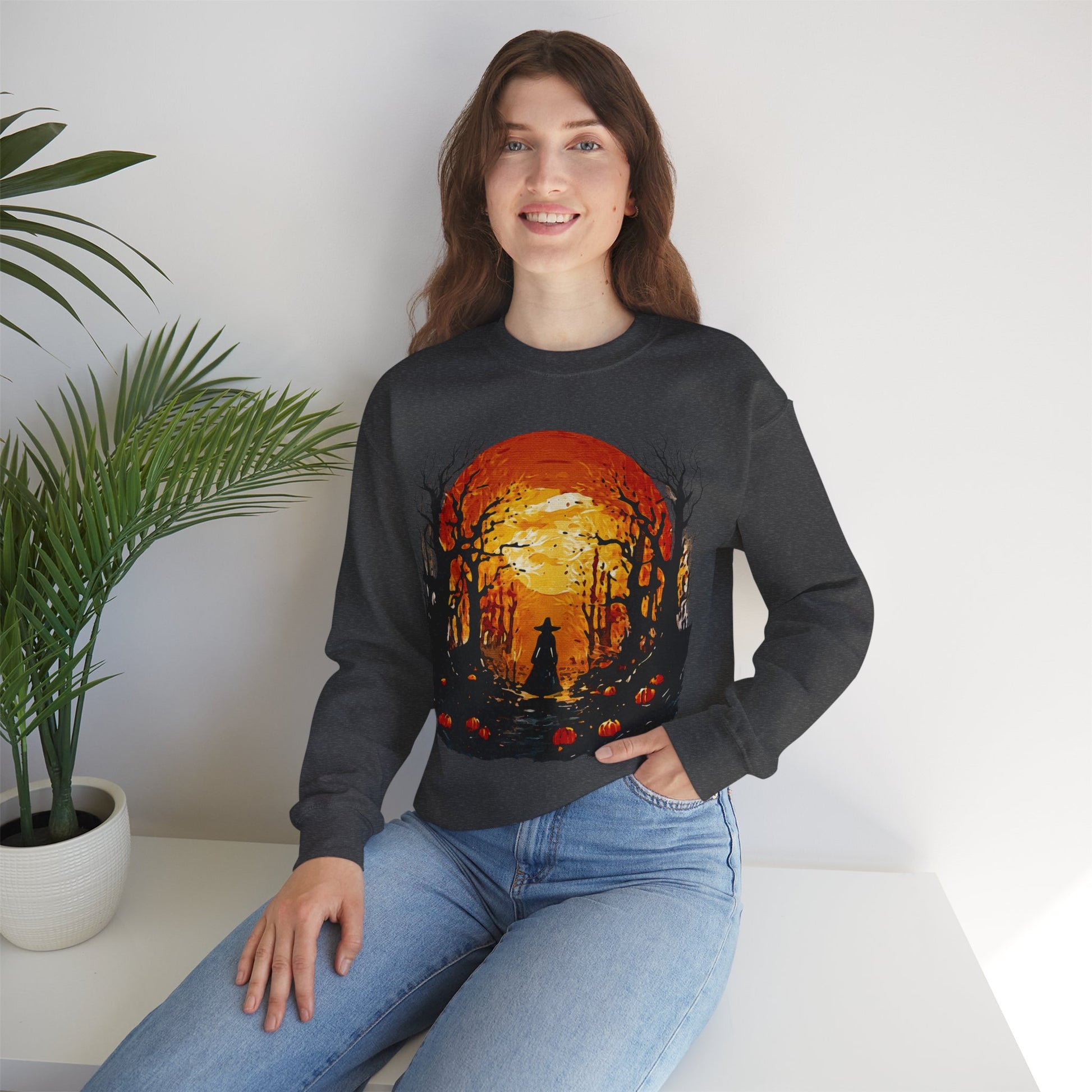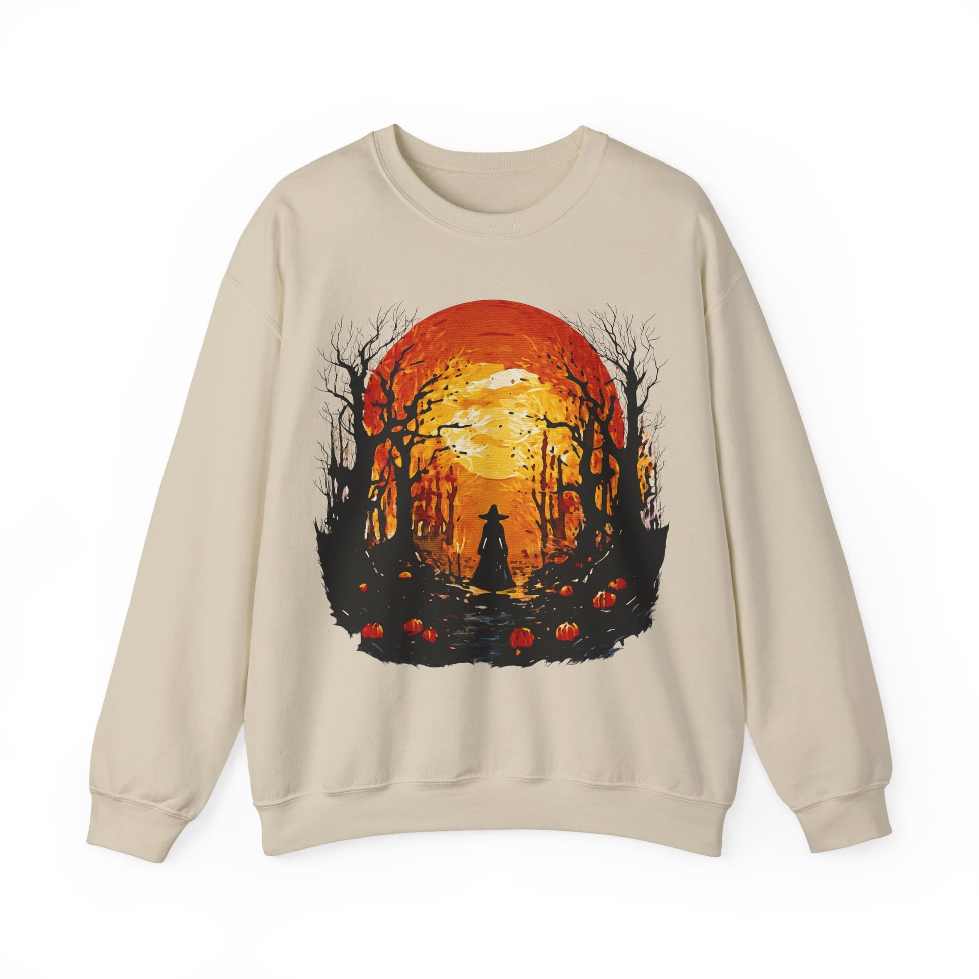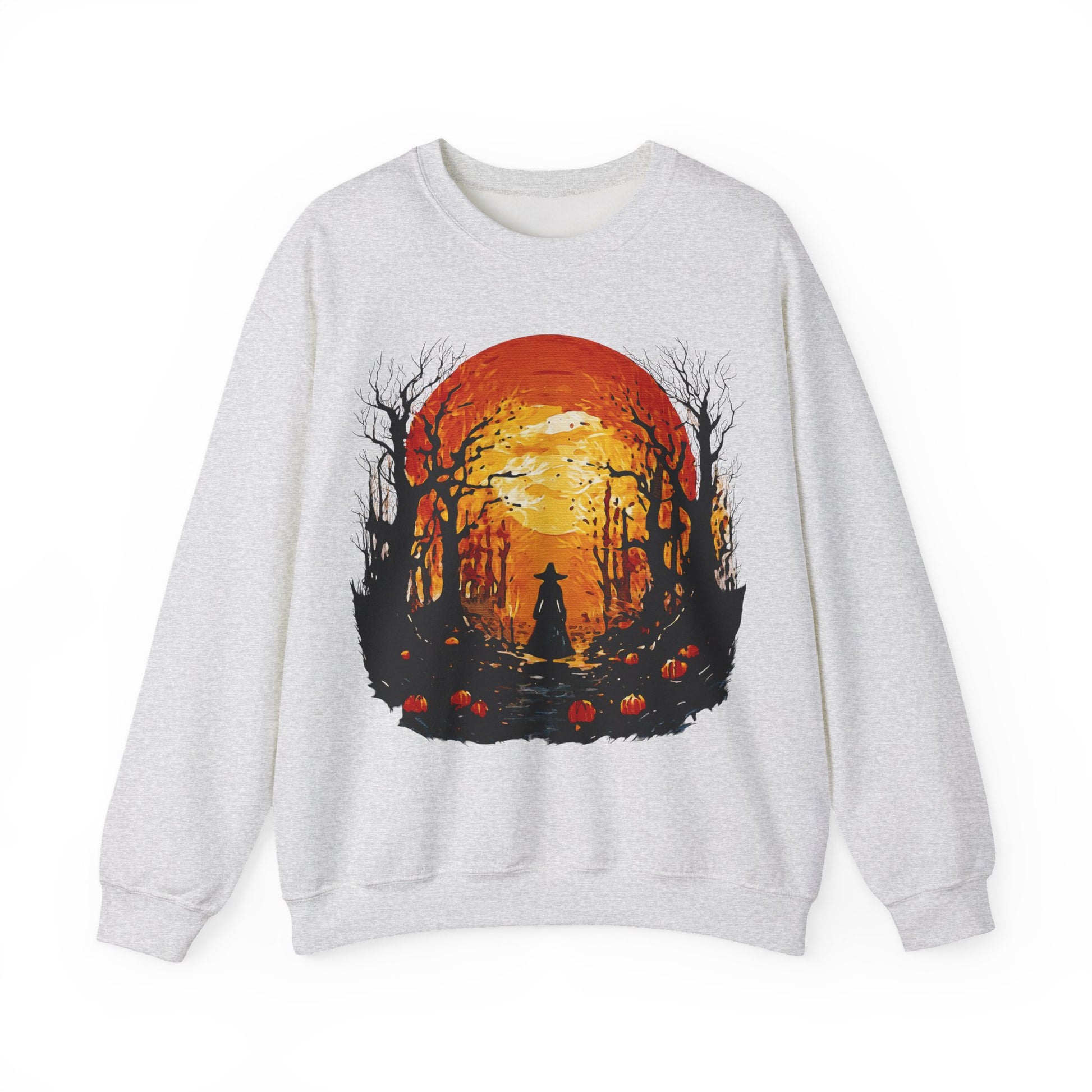 Moonlit Mischief: Autumn’s Enchanted Glow for Sweatshirts, mugs and more - Autumn Sunset Witch Sweatshirt - Cozy Unisex Crewneck for Fall, Halloween, Pumpkin Spice Lovers, Seasonal Fashion, Gift Idea