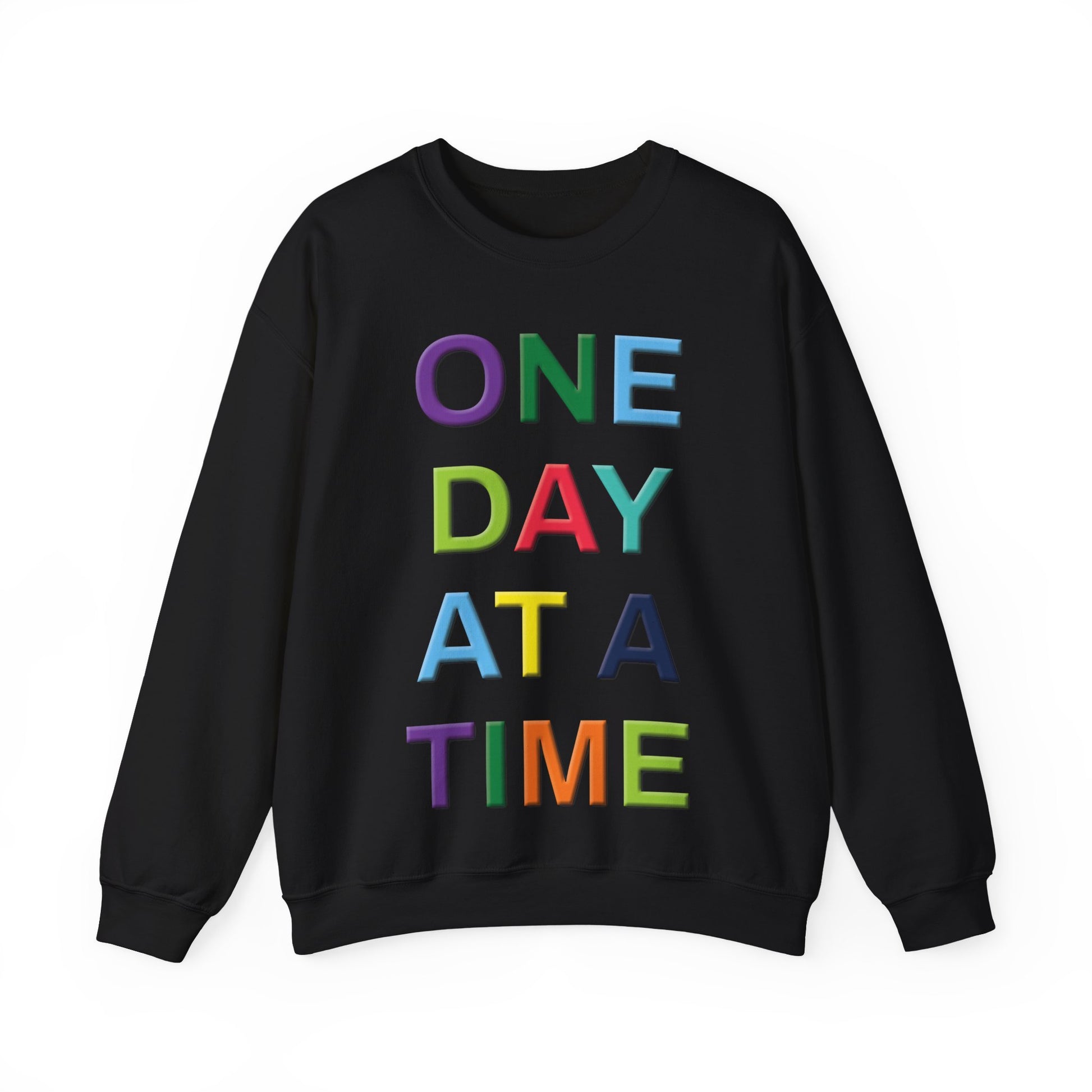 Embrace comfort and positivity with this cozy Unisex Heavy Blend™ Crewneck Sweatshirt. Featuring the uplifting message 'ONE DAY AT A TIME' in vibrant colors, this sweatshirt is designed to bring a sense of joy and motivation to your daily life. Perfect for lounging at home, running errands, or gathering with friends, its classic fit ensures a stylish yet relaxed look. Ideal for adults who appreciate comfort and a positive message, it's a meaningful gift for yourself or loved ones. This sweatshirt is suitable for various occasions, such as casual outings, wellness retreats, or as a thoughtful present for holidays like birthdays and New Year’s. Celebrate life's moments with this cheerful addition to your wardrobe!