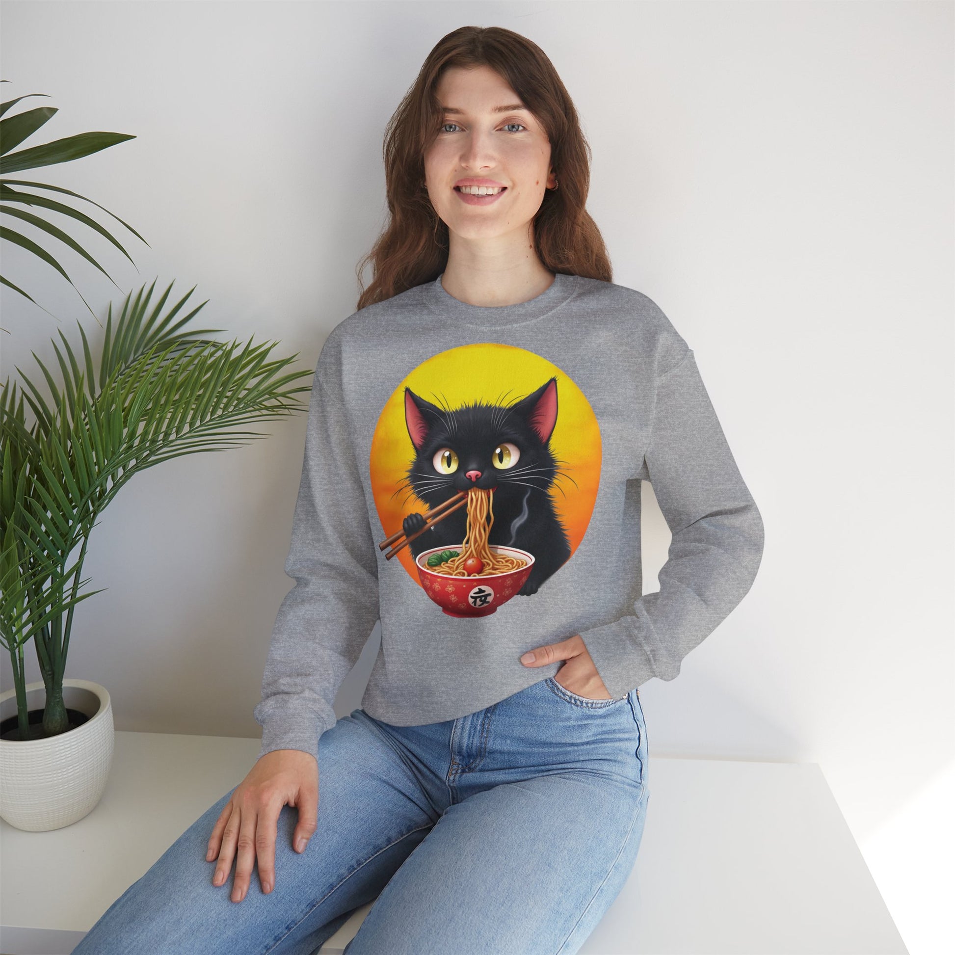 Embrace cozy vibes and unique style with this Unisex Heavy Blend™ Crewneck Sweatshirt! Featuring an adorable cat design enjoying a bowl of noodles, this sweatshirt adds a playful touch to your wardrobe. Perfect for casual outings, lounging at home, or a night out with friends, it offers both comfort and flair. Ideal for cat lovers and food enthusiasts, this sweatshirt is a delightful addition to any collection. It's versatile enough for year-round wear and makes a great gift for celebrations such as birthdays or just to brighten someone's day!