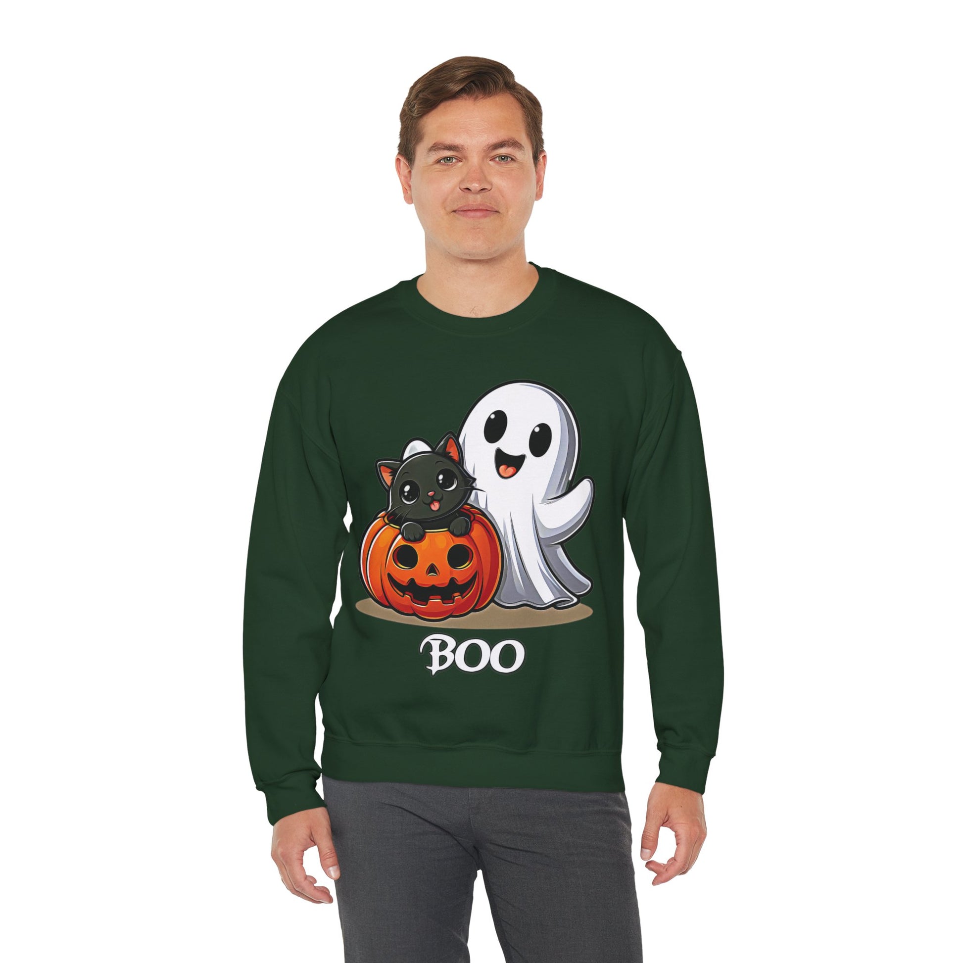 Embrace the cozy vibes this fall with our Unisex Heavy Blend™ Crewneck Sweatshirt. Perfect for chilly autumn days, this sweatshirt features a playful design of an adorable ghost and kitty nestled against a pumpkin, bringing a touch of whimsy to your wardrobe. It's not just clothing; it's a celebration of the spooky season, making it ideal for Halloween festivities, family gatherings, or just a casual day out. This sweatshirt is perfect for anyone who loves to express their fun side while staying comfortable. Designed for adults, it's a versatile piece that seamlessly fits into your lifestyle, whether you're sipping cider by the bonfire or going trick-or-treating with friends. Bring joy to the holidays with this delightful garment that pairs well with jeans or leggings for a relaxed yet stylish look.